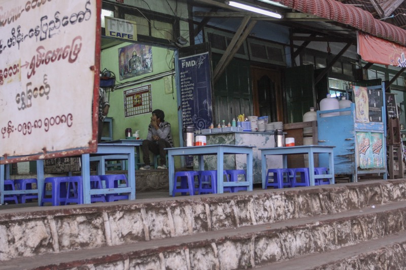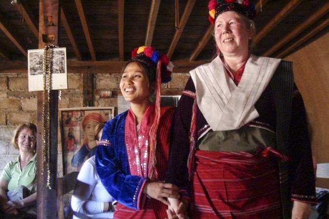 In einem der Häuser sind wir eingeladen. Es gibt Tee zu trinken und natürlich auch was zu kaufen. Traditionelle Kleidung aus Myanmar, Tücher und Kopfbedeckungen.