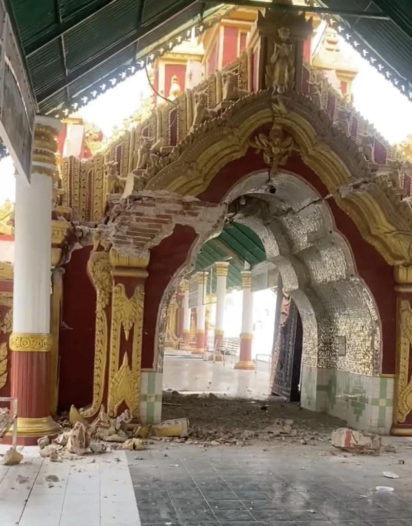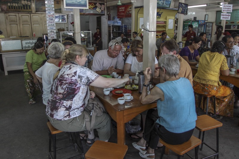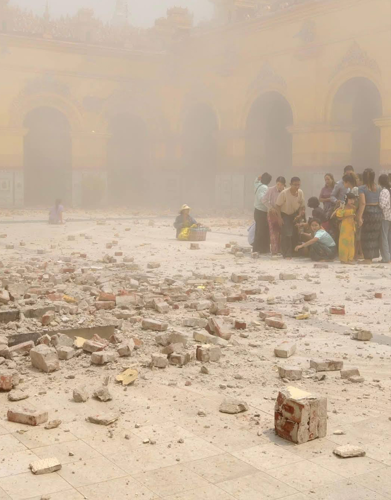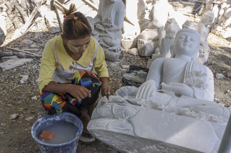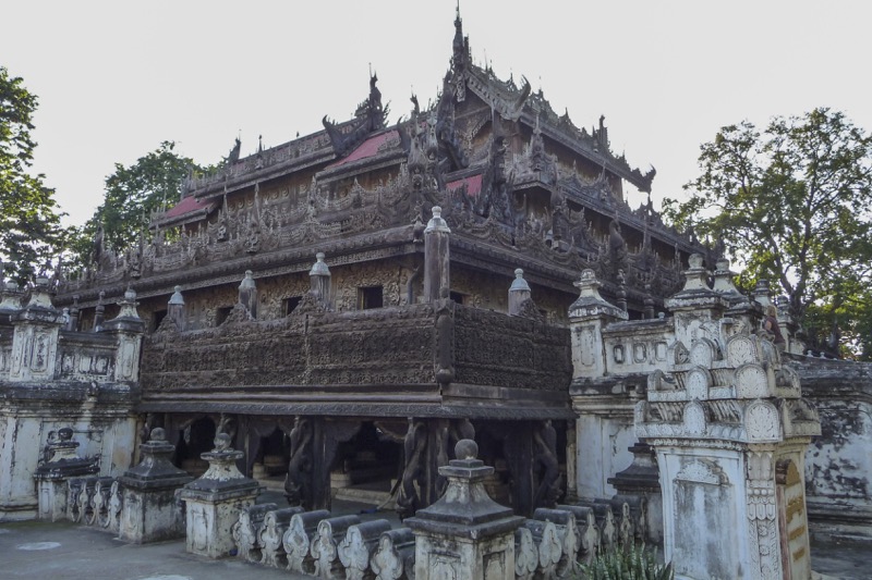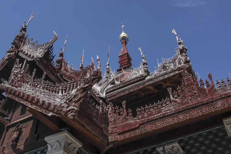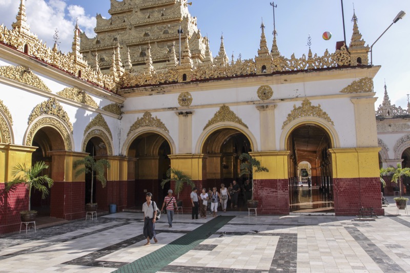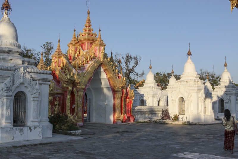 Ein Stück weiter des Weges strahlt uns schneeweiß im Sonnenlicht leuchtend die Hsinbyume-Pagode, auch Myatheindaw-Pagode genannt, entgegen. König Bagyidaw ließ sie 1816, drei Jahre vor seiner Inthronisation, für seine verstorbene Lieblingsgemahlin Hsinbyume errichten. Die Erdbebenschäden von 1838 ließ König Mindon 1874 beheben. Die Pagode symbolisiert den mythischen Berg Meru, das Zentrum der Welt. Sieben mit Wellen geschmückte Terrassen stellen die sieben Meere dar, von denen nach buddhistischer Vorstellung der Berg Meru umgeben ist. Nats, Dämonen, Monster und Nagas sind zur Bewachung in Nischen auf den einzelnen Ebenen des Bauwerks aufgestellt. Über die sieben Terrassen führen Treppen hinauf zu einem Plateau mit dem zentralen Stupa, der den Sulamani-Palast, den Sitz des Himmelsgottes Indra, darstellt. Weitere steile Treppen leiten zu einem Umgang, von dem aus man die Cella mit der Buddhastatue betritt. Bis dahin hat man zwölf gestaffelte Tore mit reich geschmückten Giebeln durchquert, sieben beim Aufstieg über die Terrassen und fünf weitere beim Aufstieg zur Cella.