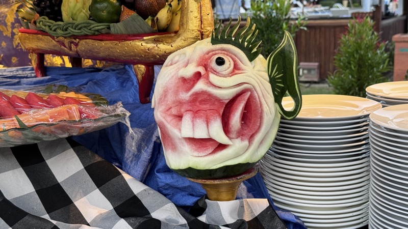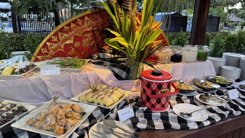 Ein tolles Buffett ist rund um den Platz vor der Bima-Stage, in sieben Ständen aufgebaut. Es gibt gegrilltes Fleisch, Spieße, Fisch, Reis in verschiedenen Variationen, Gemüse und ein Stand mit Kuchen und anderen Nachspeisen.